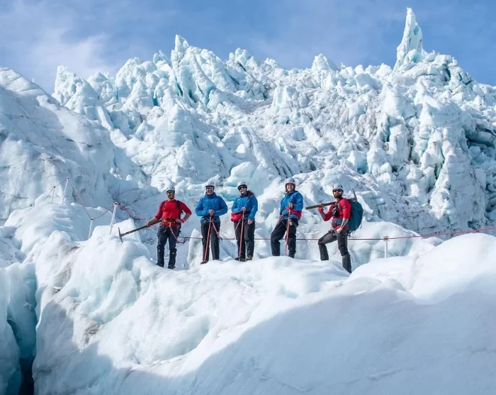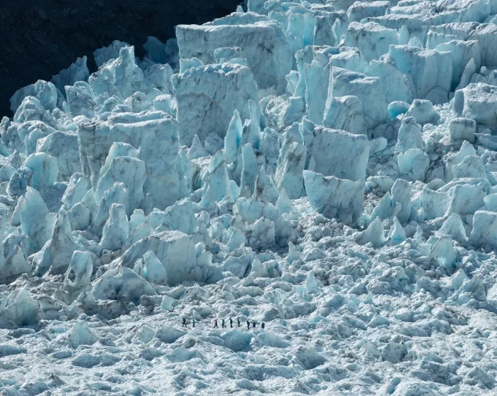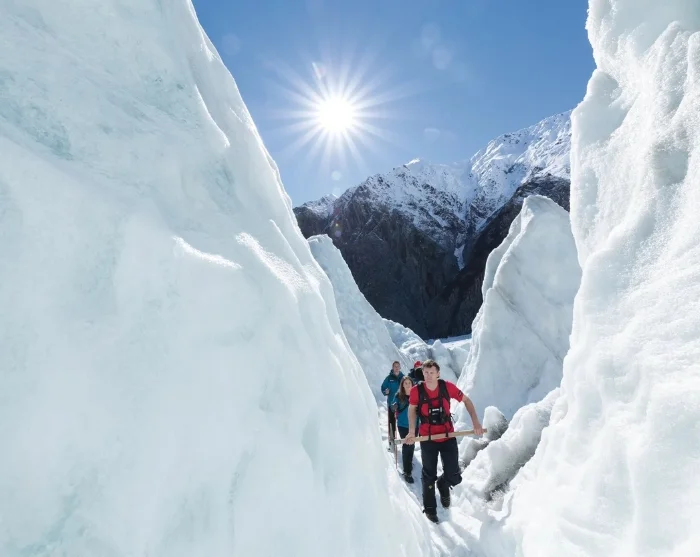 Så venter en ubeskrivelig vakker helikoptertur over regnskogen og inn over breens blå islandskap. Underveis kan du nyte utsikten til de sørlige Alpene og det dramatiske isfallet, før helikopteret lander på en trygg del av breen.