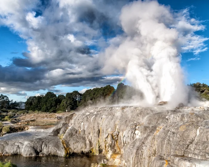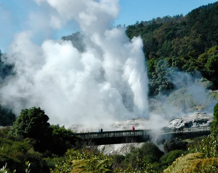 Du blir hentet på hotellet ditt i Rotorua, og første stopp på reisen er Te Puia Thermal Park. Her kan du oppleve boblende gjørme og dramatiske geysirer, blant annet Pōhutu-geyseren, som skyter opptil 30 meter til værs flere ganger om dagen.