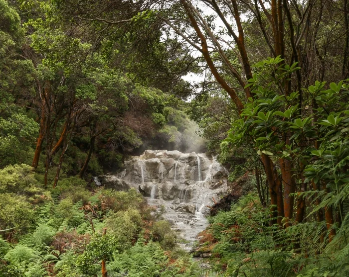 Du passerer steder med navn som “Inferno Pools”, “Sulphur Crystal Valley” og “Cooking Pool”, hvor temperaturen kan nå opptil 100 grader. Et av høydepunktene er Kakahi Falls – New Zealands største varme fossefall, som tradisjonelt ble brukt av maorikrigere til heling etter kamp.