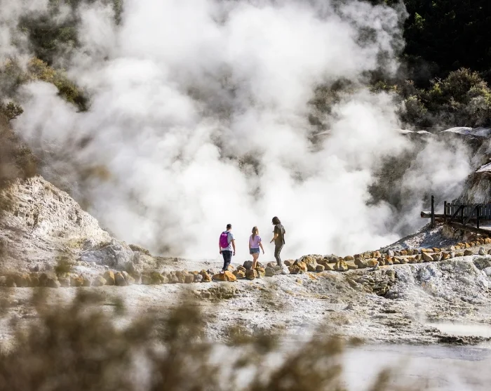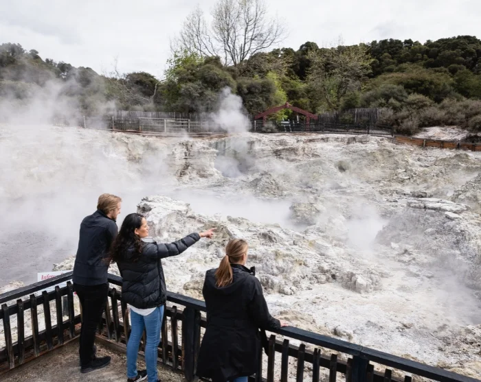 Ved ankomst starter du din selvguidede rundtur i parken, som tar omtrent 1–1,5 time. Du møtes av et landskap fullt av dampende svovelkilder, boblende gjørmepytter og kokende fossefall – alt omgitt av svovellukt, varme damptepper og krystalliserte mineralavsetninger. Ruten er tydelig merket og lett å gå, og underveis finner du informasjonstavler og utsiktspunkter som forklarer områdets unike geologi og maorienes betydning.
