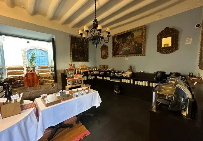 Den inkluderte frokosten serveres som buffet på hotellets restaurant Taypicamaña, som ligger ut mot byens torg.