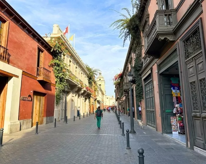 Du blir hentet på hotellet, og spaserturen går først til byens livlige sentrale torg, Plaza Mayor. Torget er vakkert dekorert med røde, hvite og gule blomster, høye palmer og en fontene med byens skytsengel på toppen. Torget er omgitt av vakre bygninger fra kolonitiden, som regjeringspalasset, erkebiskopens palass og Limas imponerende katedral, der Pizarros jordiske levninger er stedt til hvile.