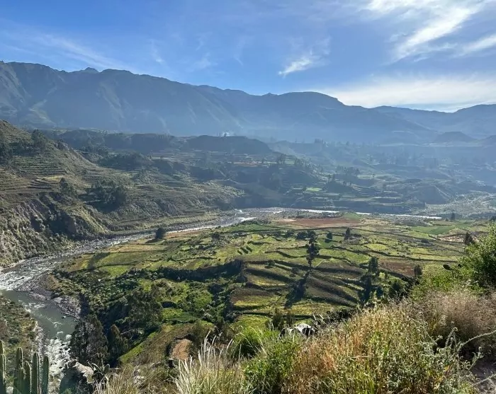 Etter denne imponerende naturopplevelsen skal du gå en kort tur i dalen, og der kan du se de gamle landbruksterrassene som har vært i bruk i flere århundre. Det er også gode muligheter til å kjøpe fargerike suvenirer. Heretter kjører du tilbake til Chivay for å spise lunsj før du setter deg på bussen til Puno.
