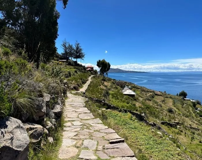 Du spiser lunsj på den vakre, kuperte øya, og deretter tar guiden deg med på en tur til fots, opp til øyas høyeste punkt. Her er det flott utsikt over Titicacasjøen, med høye fjell i bakgrunnen.