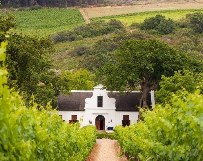 I går så du det blågrå havet man nesten alltid har utsikt til i Cape Town – nå ser du grønne vinmarker, hus oppført i den karakteristiske kapp-hollandske stilen og fjellene i bakgrunnen som er en medvirkende årsak til at dalene i Vinlandet er så godt egnet til dyrking av vin.