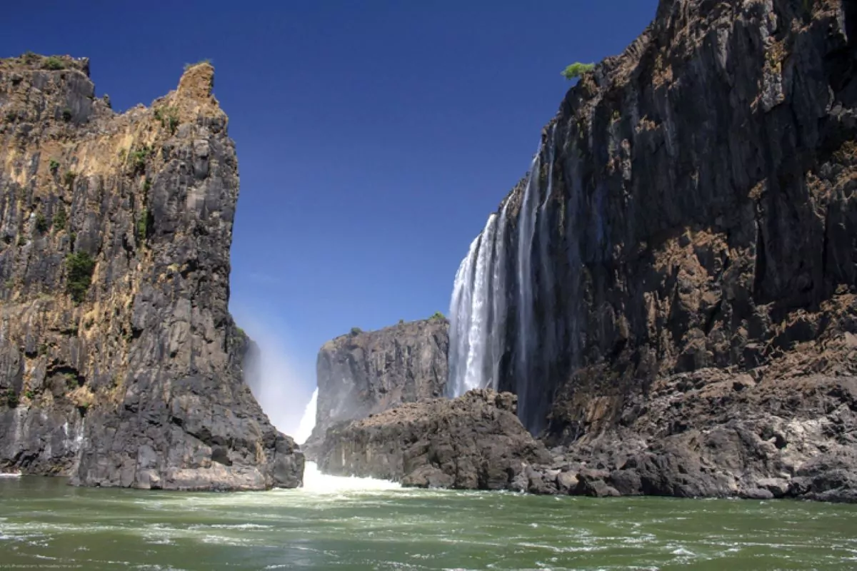 På nært hold er vannfallene nesten uvirkelige. Over 1000 kubikkmeter vann pr. sekund velter ca. 100 meter ned i basaltsluktene i Batoka Gorge. Fallene er 1,7 km brede og utgjør grensen mellom Zambia og Zimbabwe.