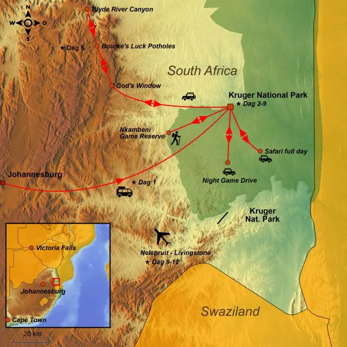 Først opplever du Sør-Afrikas vakre natur og dyreliv på safari i Kruger-safari fra lodgen din. Den ligger bare et steinkast fra Kruger nasjonalpark. Du avslutter reisen ved et av verdens mest spektakulære vannfall.