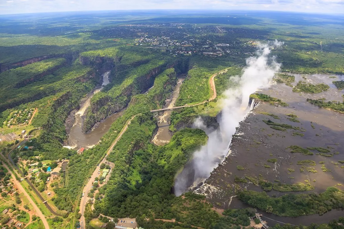 Ofte får du allerede fra luften øye på de mektige Victoria Falls for første gang. Vannspruten rager flere hundre meter opp i luften, og du forstår raskt hvorfor vannfallene lokalt kalles “Mosi-oa-Tunya” – røyken som tordner. Det ligner virkelig røyk, men regnbuene som danser i solens stråler gjør det raskt klart at det virkelig er vann her.