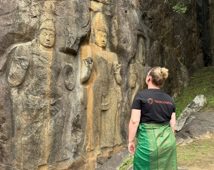 Underveis stopper du ved Buduruwagala-tempelet, som stammer helt tilbake fra 900-tallet og er kjent for sine godt bevarte klippeutskjæringer. Tempelet består av en stor klippevegg hvor en 16 meter høy Buddha-statue ruver, omgitt av seks mindre figurer som viser Buddha i ulike meditasjonsstillinger. Disse detaljrike og fredfulle uttrykkene kan du utforske i ditt eget tempo, da Buduruwagala har et mer rolig preg enn mange av de mer kjente templene på Sri Lanka.