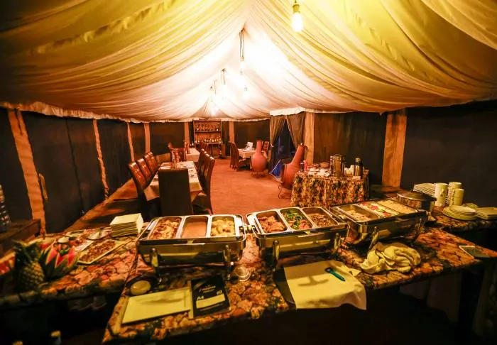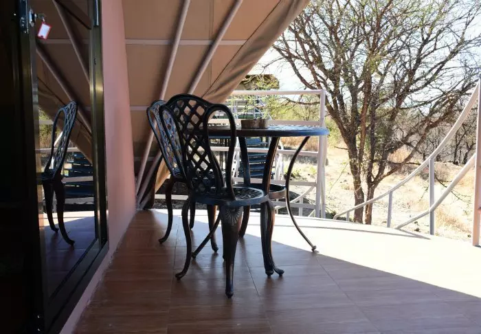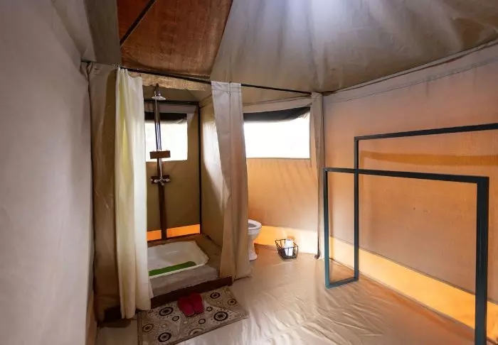 Teltleiren består av syv luksustelt, som alle ligger på sin egen platting med balkong, og utrolig utsikt over Dindira-sletten. Teltene er store og romslige og svært godt utstyrt. De har et eget bad – som imidlertid er best egnet for par som reiser sammen – og veldig komfortable senger.