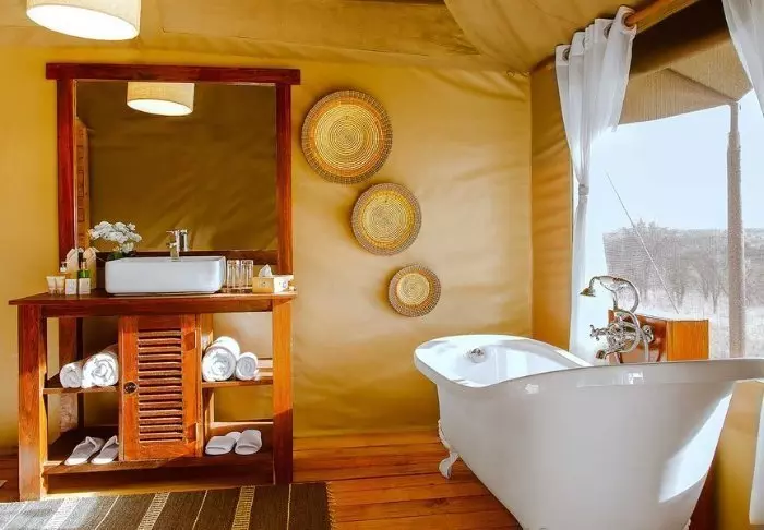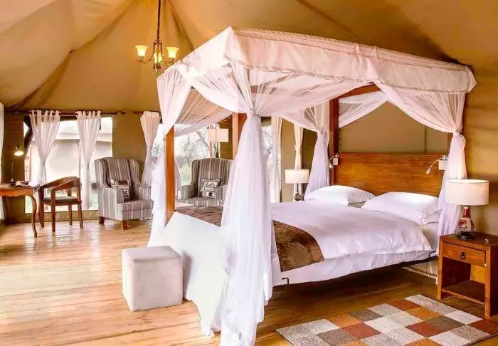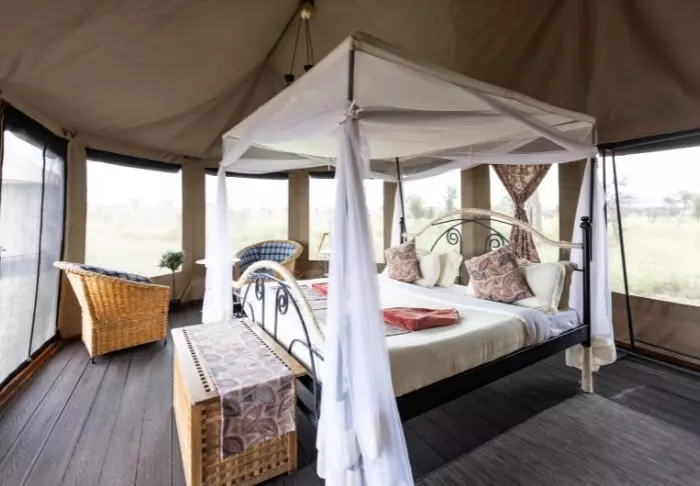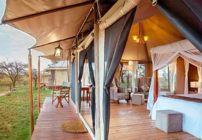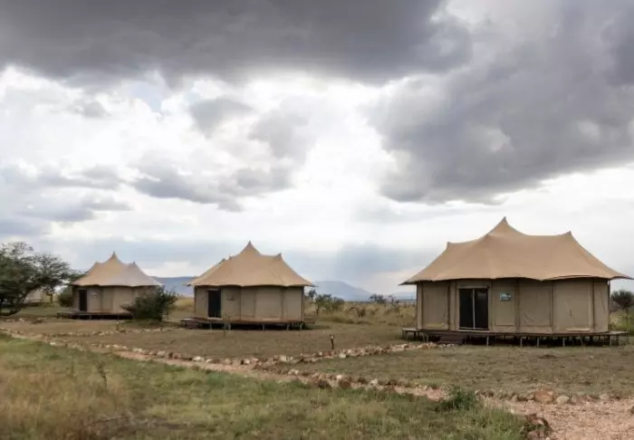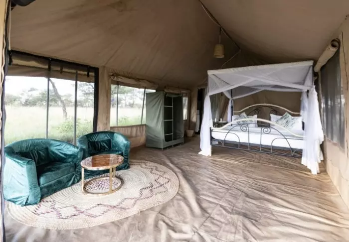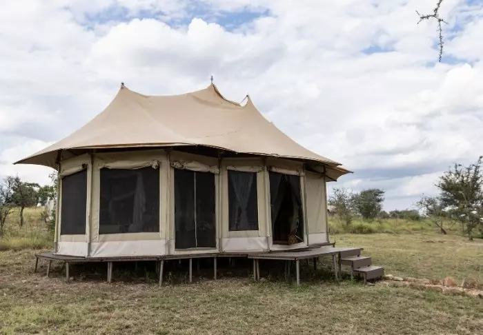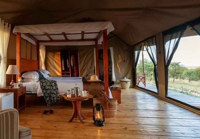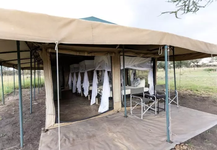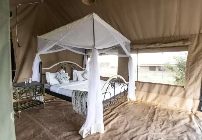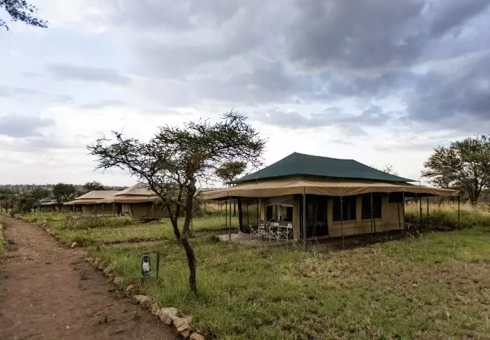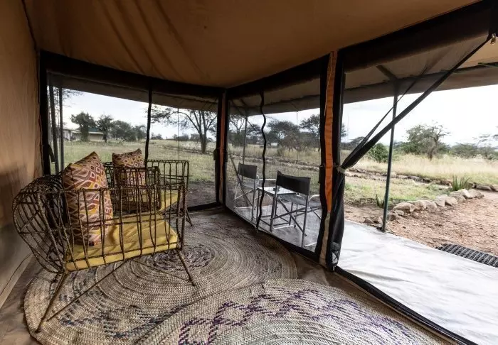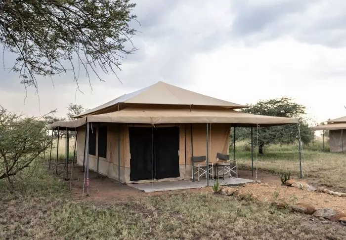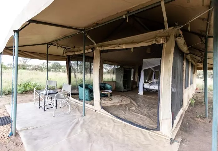 Teltene er store og har god plass og mye luft rundt de to kingsize-sengene. Fra oppholdsrommet kommer du rett ut på en stor, gjennomgående veranda, og herfra har du den mest fantastiske utsikten over Serengeti Plains. Alle teltene har eget bad med toalett og dusj. Det er også et badekar der du kan ligge og slappe av med direkte utsikt over nasjonalparken. Det er også privat utendørsdusj, og også herfra er det flott utsikt over Serengetis sletter.