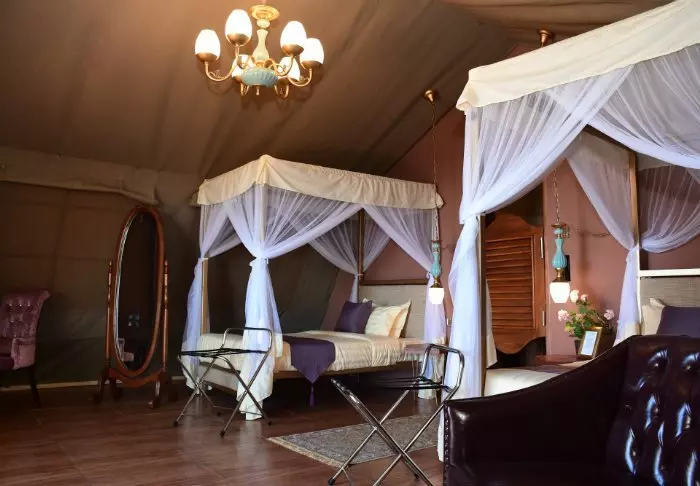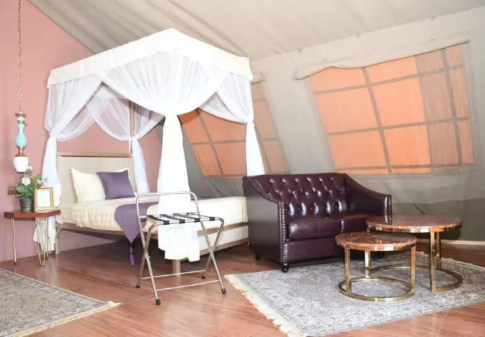 Alle teltene er fint innredet med himmelseng med myggnett, skrivebord, sofa og lysekrone. Her har du virkelig god plass.