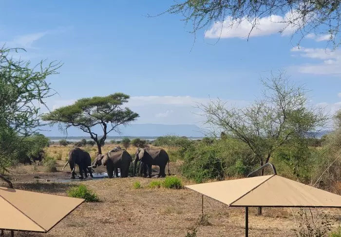 “Varmelokket” som hele dagen har ligget over Tarangire som en tung dyne, letter langsomt. Skyggene blir lengre, og selv vinden faller til ro. Du har akkurat avkjølt deg i bassenget etter dagens safari, og nå kommer kelneren med en kald øl mens du legger deg til rette på solsengen. Du holder øye med bushbukkene som nærmer seg vannhullet noen hundre meter fra bassenget. Det er blitt ledig, for nå er elefantene ferdige med å dusje seg.