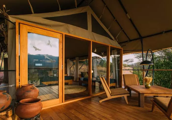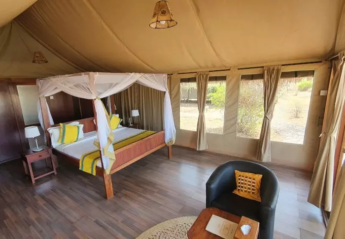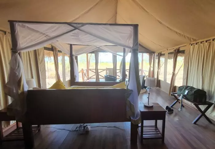 Lodgen består av 10 luksustelt med stålramme og vegger av lerret. Her er det høyt under taket, og badet, som har murvegger, ligger i forlengelsen av rommet. Alle de 10 luksusteltene er bygget på hver sin individuelle plattform med en stor terrasse av tre, og derfra har du flott utsikt til saltvannssjøen Lake Eyasi.