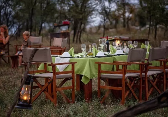 Måltidene spises som regel i messeteltet – hvis det ikke dekkes opp i bushen utendørs, og da kan du spise med utsikt til den afrikanske kveldshimmelen ved et hyggelig leirbål.