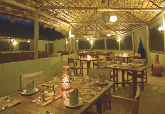 Fra både restauranten, baren og bassenget er det utsikt til vannhullet – og ofte nytes middagen ved bassenget, under åpen himmel med utsikt til millioner av stjerner.
