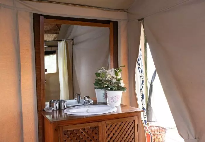 Her er det 24 telt med plass til 2 eller 3 personer i hvert telt. Teltene er store, og alle har dusj og toalett, skrivebord og store senger med myggnett. Hvert telt har dessuten en liten ”terrasse” med hagestoler, der du kan slappe av og nyte de fantastiske omgivelsene. I tillegg er det et stort fellestelt som blir brukt som spisetelt.
