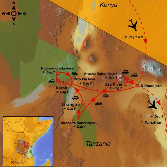 I dag kommer dere til Kilimanjaro i Tanzania. Våre lokale guide møter dere på flyplassen og kjører dere til hotellet deres. Her har dere to overnattinger. Resten av dagen er til fri disposisjon til å finne dere til rette i Afrika, og kanskje ta en dukkert i bassenget?