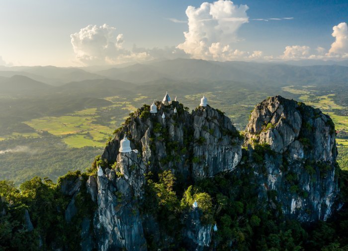 Du kommer til en parkeringsplass der en shuttlebuss kjører deg det siste stykket opp fjellet. Her fører 500 trinn til toppen av et av Thailands flotteste utsiktspunkter. Turen opp er anstrengende, men når først du står på toppen, belønnes du med en ubeskrivelig panoramautsikt over landsbyene, Thung Thung-dalen og ikke minst tempelets hvite pagoder som hviler på skyhøye fjelltinder – et helt fantastisk syn! Guiden forteller deg historien om det religiøse byggverket, som faktisk bare er noen få år gammelt, og du har god tid til å oppleve stedet og det imponerende arbeidet.