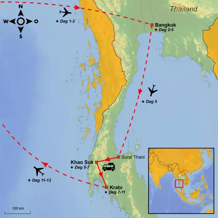 Du blir hentet på hotellet og kjørt til flyplassen, hvorfra du flyr sørover til Surat Thani – en flytur på 1 time og 15 minutter. Etter landing henter du bagasjen din og møter sjåføren din, som står med et TourCompass-skilt ute i ankomsthallen. Han kjører deg til Khao Sok nasjonalpark, hvor et ekte jungeleventyr venter.