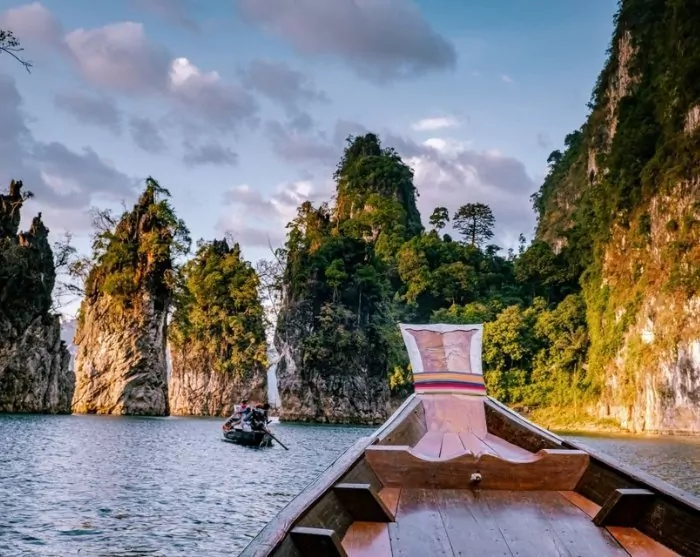 Deretter blir du kjørt til Ratchabrapa-kaien, like ved den imponerende demningen. Her går du ombord i en liten motorbåt, og den tar deg med ut på Cheow Lan-sjøen, der du kan beundre det majestetiske landskapet med de ikoniske kalksteinsklippene.
