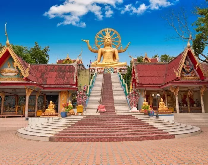 Første besøk er Big Buddha-templet, Koh Samuis vartegn. 72 trinn fører opp til den enorme Buddha-statuen som rager flott i været og skinner med sin gullbelagte overflate. Her oppe er det også en fantastisk utsikt over havet.