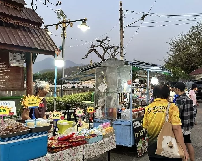 Hver kveld forvandles Walking Street til et livlig nattmarked, der du kan utforske alle matbodene og la deg friste av det lokale kjøkkenet. Kveldens måltid inntas på et teppe ved et lavt bord, akkurat slik lokalbefolkningen gjør det. Her kan du også beundre Wat Chong Kham-tempelet, som speiler seg i innsjøen med samme navn.