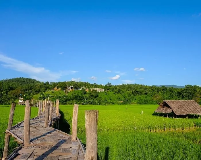 Turen fortsetter til den ikoniske Sutongpe-broen. Den imponerende bambusbroen strekker seg over frodige rismarker og forbinder en landsby med det buddhistiske tempelet Wat Phu Sama. Sutongpe-broen er en av Thailands lengste bambusbroer, og er ca. 500 meter lang. Den ble bygget av lokale landsbyboere og munker som et symbol på samarbeid og tro. Broen spiller fortsatt en rolle i hverdagen, da munkene krysser den daglig på vei til å be om almisser.
