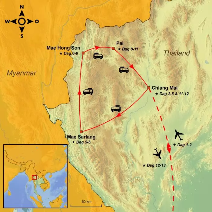 Eventyret starter i Chiang Mai, en sjarmerende by som er rik på kultur og historie, og som ligger vakkert til i en dal omgitt av majestetiske fjell. Herfra legger du ut på den berømte Mae Hong Son-loopen – en spektakulær rute på mer 600 km som snor seg gjennom 1864 hårnålssvinger gjennom fascinerende landskaper.