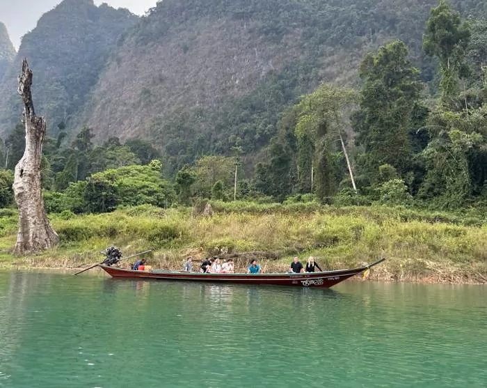Deretter blir du kjørt til Ratchabrapa-kaien, like ved den imponerende demningen. Her går du ombord i en liten motorbåt, og den tar deg med ut på Cheow Lan-sjøen, der du kan beundre det majestetiske landskapet med de ikoniske kalksteinsklippene.