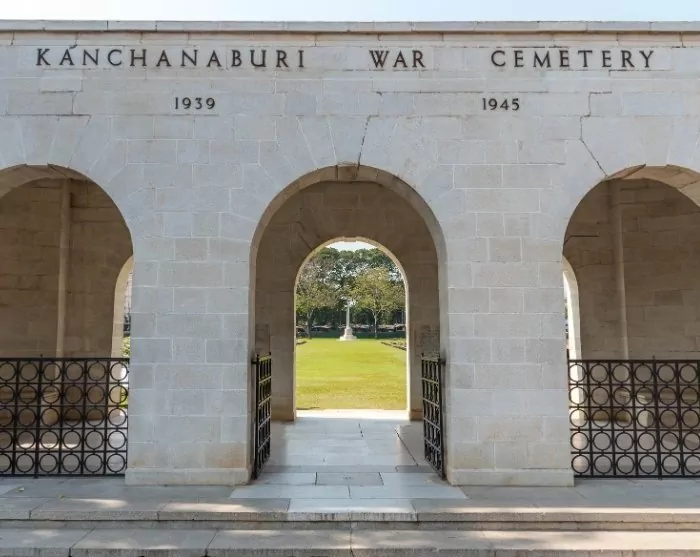 Du fortsetter til Kanchanaburi-krigskirkegården, et minnesmerke for mer enn 6000 allierte krigsfanger som døde under byggingen av jernbanen, og som ble flyttet til dette endelige hvilestedet etter krigen.