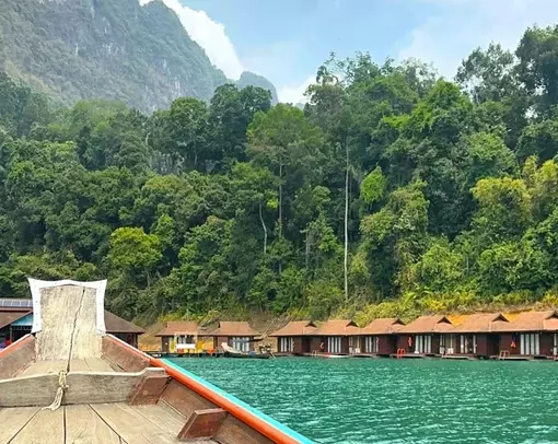 Ved Cheow Lan-innsjøen bor du i en flytende bungalow omgitt av majestetiske kalksteinsklipper og speilblankt vann. Du kan bade rett fra verandaen, padle kajakk, dra på båtsafari ved solnedgang og i morgengryet, og nyte stillheten når disen letter over vannet – en magisk opplevelse.
