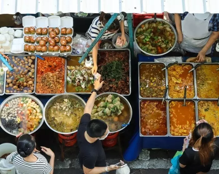 Ute i jernbanestasjonens ankomsthall venter en guide med et TourCompass-skilt, og herfra blir du kjørt til det lokale markedet Talad Warorot, der frokosten serveres.