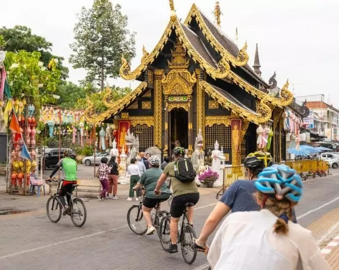 Du blir kjørt til kontoret til samarbeidspartneren vår, og her får du sykkel og sykkelhjelm. Etter en rask briefing er det tid til å ta pedalene fatt og oppleve byens sjarm. Ruten er enkel og flat, så de fleste kan være med. Du sykler gjennom Chiang Mais små, rolige gater til det fine tempelet Wat Inthakhin Sadue Mueang, kjent for sin 700 år gamle, hvite Buddha-statue. Sykkelturen fortsetter forbi De tre kongers monument til byporten, Tha Phae Gate. Det var her selgere brakte varer inn i byen. Her forteller guiden deg om Chiang Mai som tidligere handelssentrum. Du fortsetter til det nærliggende markedet Somphet, der du har tid til å rusle rundt og oppleve den lokale stemningen. Du får også mulighet til å smake på markedets fargerike frukter og søtsaker. Deretter venter Wat Chiang Man, Chiang Mais eldste tempel. Det er her den 1800 år gamle krystall-Buddhaen og den 2500 år gamle marmor-Buddhaen oppbevares. Til slutt får du se byens største og ikoniske monument, Wat Chedi Luang, som en gang huset Smaragdbuddhaen. Den oppbevares nå i templet Wat Phra Kaew i Bangkok.