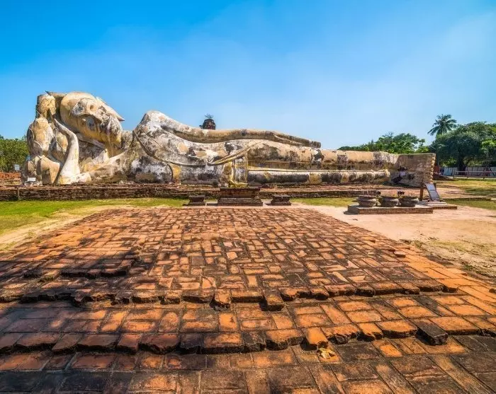 Siste stopp er det gamle klosteret Wat Lokaya Sutha. Her er det ikke mye mer igjen enn restene av gamle gulv, vegger og søyler. Stedets store attraksjon er den 37 meter lange, liggende buddhaen med det fredelige smilet.