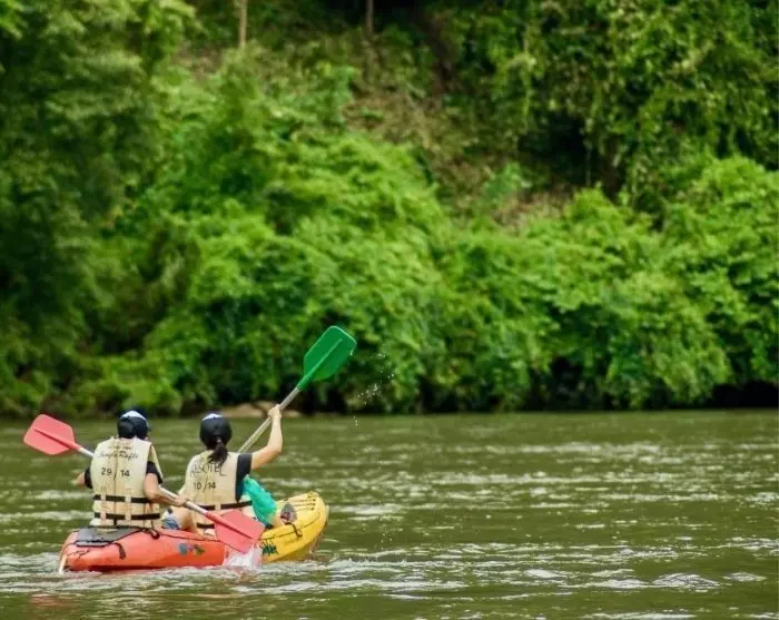 Du drar tilbake til River Kwai Jungle Rafts, et såkalt flotell eller tømmerflåtehotell på elven Kwai. Landskapet og frodigheten er nesten ubeskrivelig! Ved ankomst er det innsjekking, og deretter serveres lunsjen.