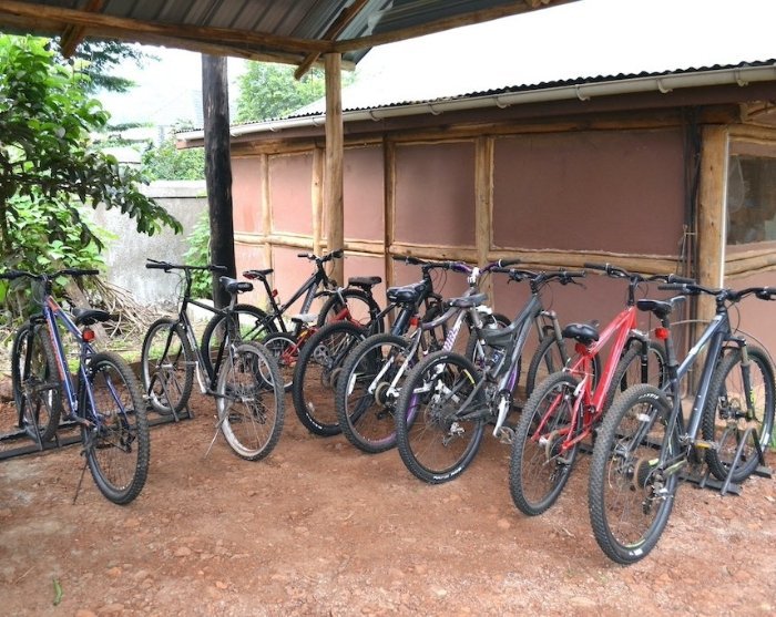 Nå skal du bli med på en guidet sykkeltur gjennom landsbyene i området i selskap med en guide som forteller deg om dagliglivet i Uganda. Ruten er ikke 100 % fastlagt, så du kan selv være med på å bestemme tempoet og hvor turen skal gå. Turen tar 2–4 timer, og det finnes sykler i ulike størrelser og sykkelhjelm til alle. Og bare slapp av, syklene er i god stand – det hele startet tross alt med et sykkelverksted….