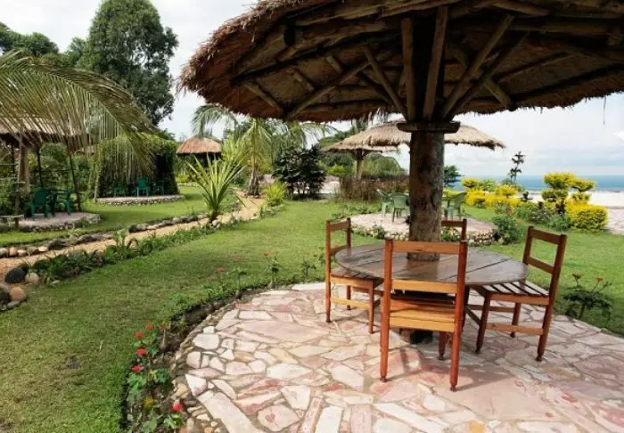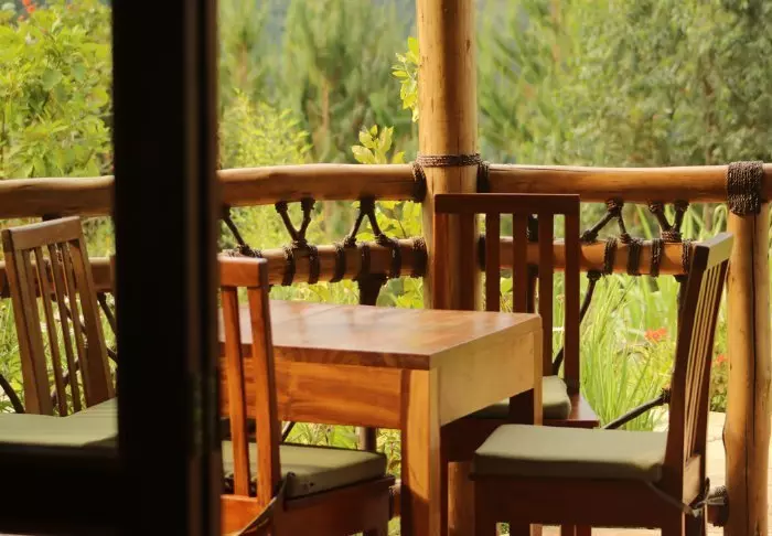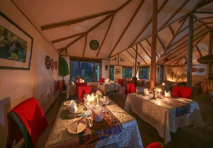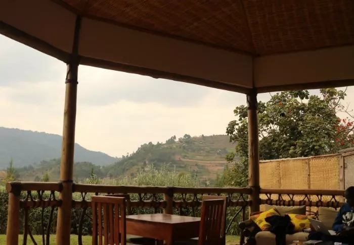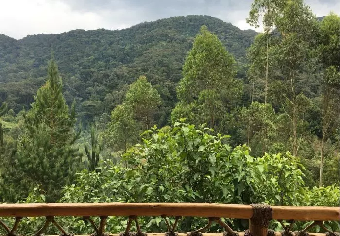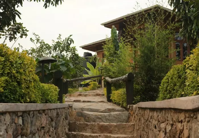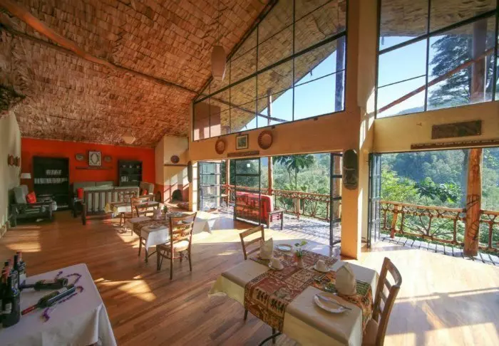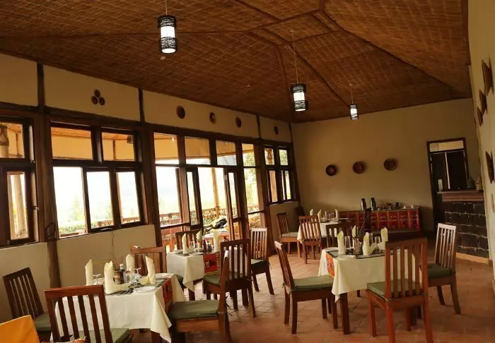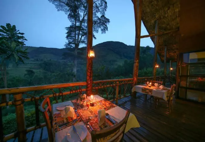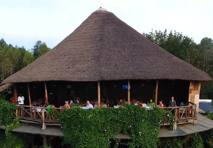 Hovedbygningen med restaurant, bar og loungeområde ligger på toppen av skråningen, og her har du ikke bare en helt fantastisk utsikt, men også ren, frisk luft fra skogen og dens mange trær mens du spiser maten din. Fra hovedbygningen går det en sti som fører deg rett til Rushaga-porten og inn i nasjonalparken.