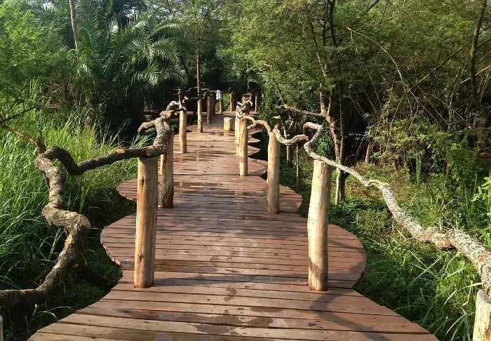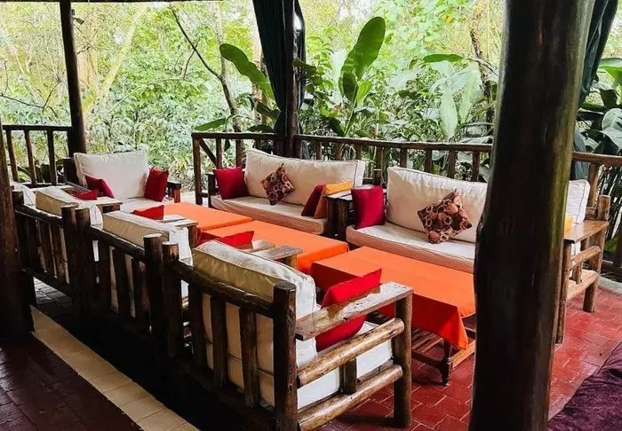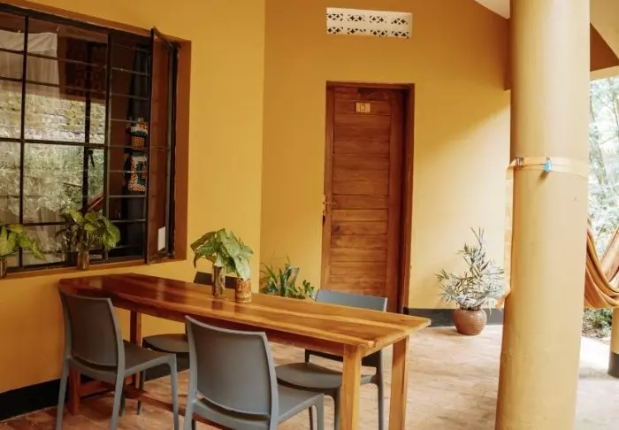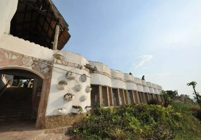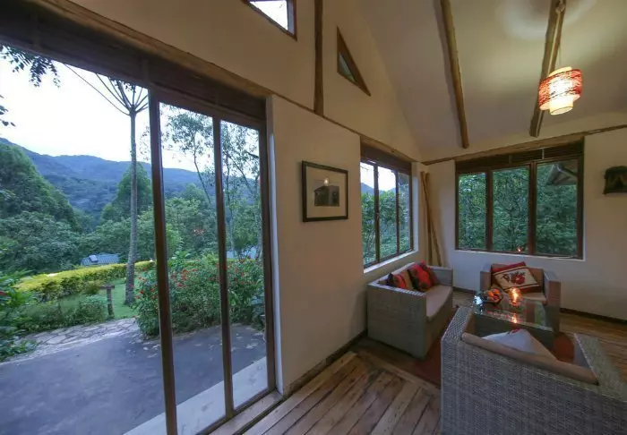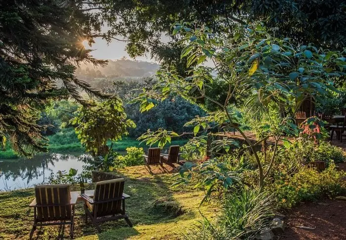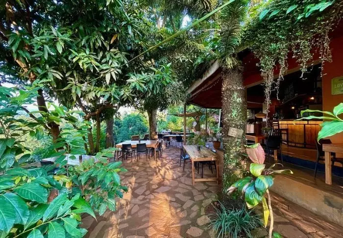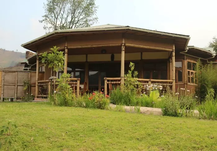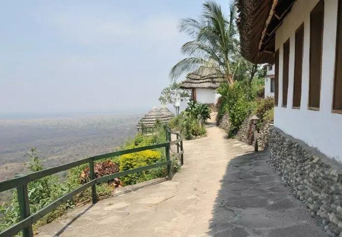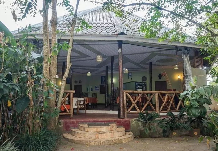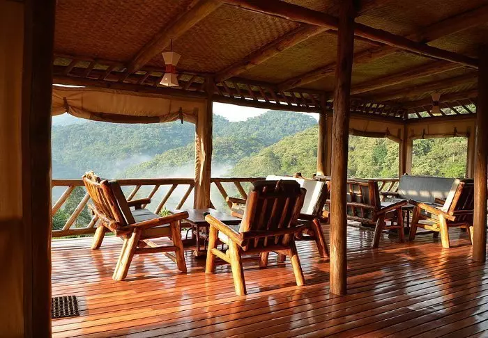 Hovedbygningen med restaurant, bar og loungeområde ligger på toppen av skråningen, og her har du ikke bare en helt fantastisk utsikt, men også ren, frisk luft fra skogen og dens mange trær mens du spiser maten din. Fra hovedbygningen går det en sti som fører deg rett til Rushaga-porten og inn i nasjonalparken.