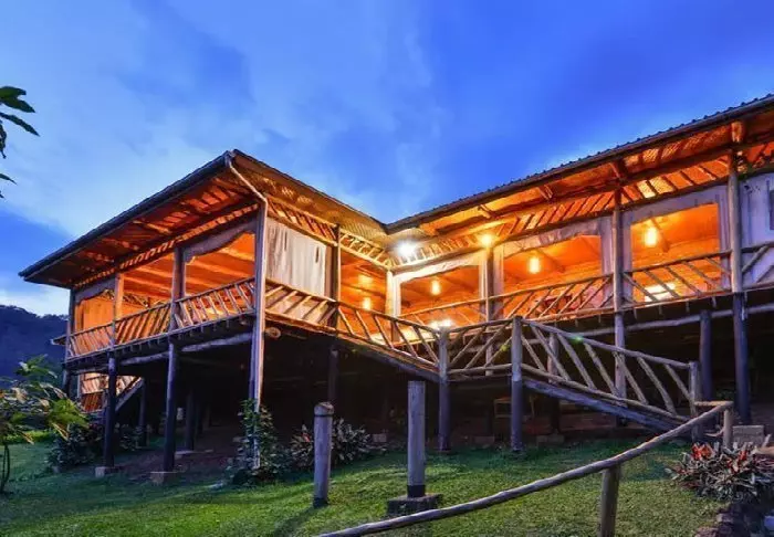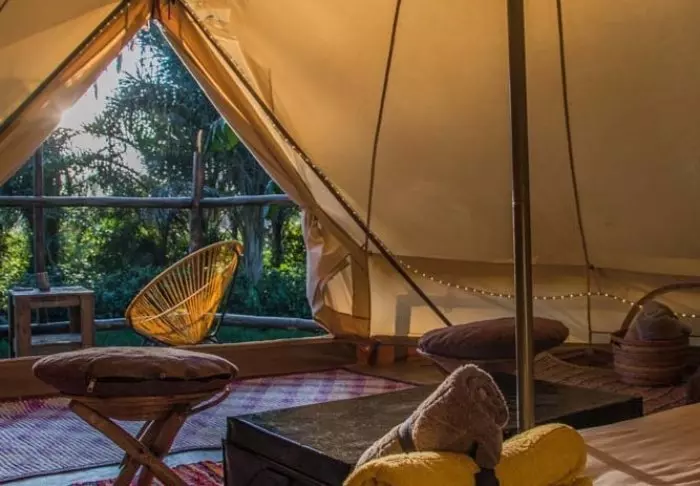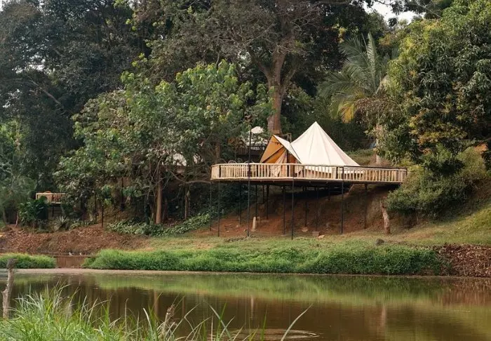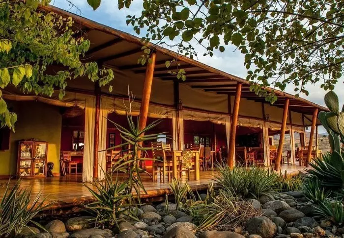 Lodgen består både av hytter og telt, og alle er sjarmerende innredet med eget bad/toalett og veranda. Det er kun brukt lokale materialer til lodgen, og alt er bygget av lokale håndverkere, så inntektene har kommet lokalsamfunnene i området til gode.