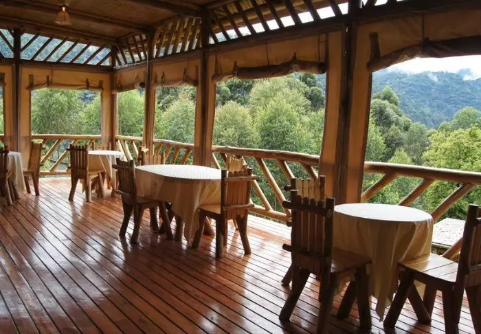Hovedbygningen har en stor panoramaterrasse som strekker seg over hele bygningens forside. Her kan du nyte utsikten over skogen mens du lytter til alle skogens fugler og den rennende elven. Her ute, blant naturens avslappende lyder, kan du også spise frokost og middag eller drikke din ettermiddagste. Du kan også spise innendørs foran den koselige peisen. Frokost, lunsj, ettermiddagste og middag er inkludert.