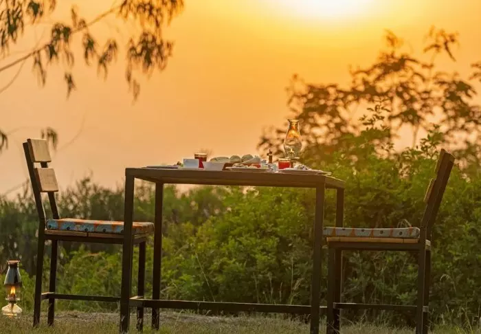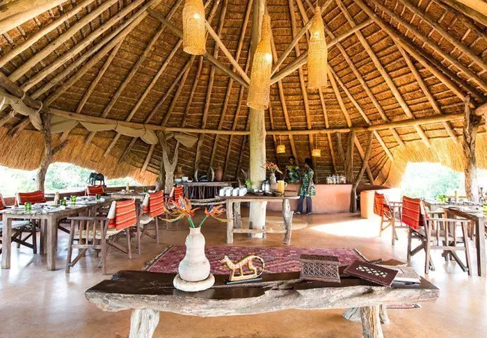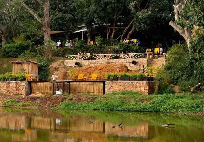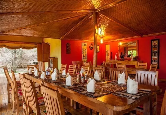 Også i lodgens hyggelige stråtekte restaurant på toppen av fjellet kan du betrakte alle dyrene ved vannhullet og beundre de storslåtte solnedgangene over parken mens du spiser en av de velsmakende rettene som tilberedes av lokale råvarer og produkter fra lodgens egen hage. En sval bris fra Kachera-sjøen gjør dessuten restauranten til et perfekt sted å avkjøle seg på varme dager.