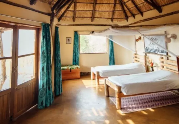 Lodgen består av både strådekte hytter og store telt med lerretsvegger. Alle rom er rustikt, men komfortabelt innredet med eget bad og toalett, safe, myggnett over sengene, solcellelys og USB-ladere. Hele lodgen bruker solenergi, så vær oppmerksom på at det ikke er tillatt å bruke for eksempel hårføner.