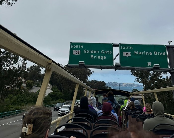 Ikke gå glipp av turen over Golden Gate Bridge, der bussen stopper på et berømt utsiktspunkt. Hvis du sitter på øvre dekk på den åpne dobbeltdekkerbussen, kan du glede deg til å føle den friske vinden fra Stillehavet mot ansiktet mens du ser den enorme stålbroen passere over hodet. Fra utsiktspunktet har du flott utsikt over den ikoniske røde broen og San Francisco Bay med byens tak og Alcatraz i bakgrunnen.