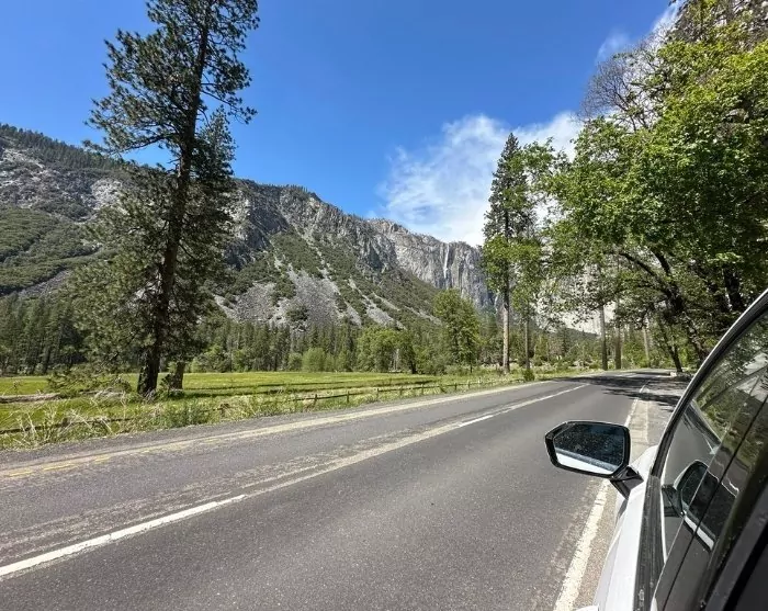 Når du nærmer deg parken (via Arch Rock Entrance), får du oppleve hvordan byens liv gradvis erstattes av golde landskaper og etter hvert fjell: Sierra Nevada-fjellene, hvor Yosemite ligger. Den siste timen med kjøring inn i selve Yosemite Valley er ubeskrivelig vakker, med loddrette fjellvegger, grantrær og den turbulente elven Merced River, som følger deg hele veien.
