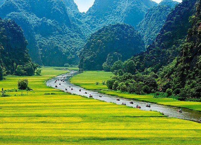 I nærliggende Trang An går du om bord i en sampan – en liten, flat trebåt. Len deg tilbake og nyt den 2,5 timers båtturen mens du vugger stille på elven gjennom et malerisk landskap av bølgende rismarker og grønnkledte kalksteinsklipper som ruver mot himmelen. Landskapet står på UNESCOs verdensarvliste og kalles Ha Long-bukten på land. Underveis er du innom flere grotter og kan nyte det rike fuglelivet. Når du kommer i land igjen går turen tilbake til Hanoi.