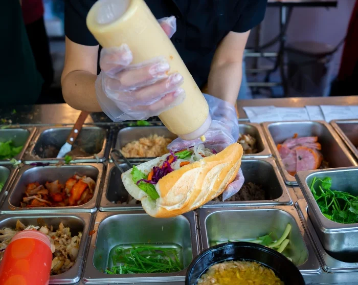 Herfra rusler du i et rolig tempo gjennom gaten og opplever hvordan små pop up-restauranter dukker opp etter hvert som mørket senker seg. Underveis stopper dere for å smake den vietnamesiske rispapirpizzaen, banh trang nuong, og den ikoniske, sprø vietnamesiske sandwichen banh mi, som på perfekt vis kombinerer fransk og vietnamesisk smak.