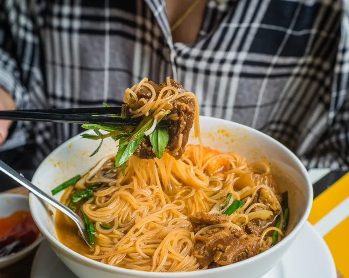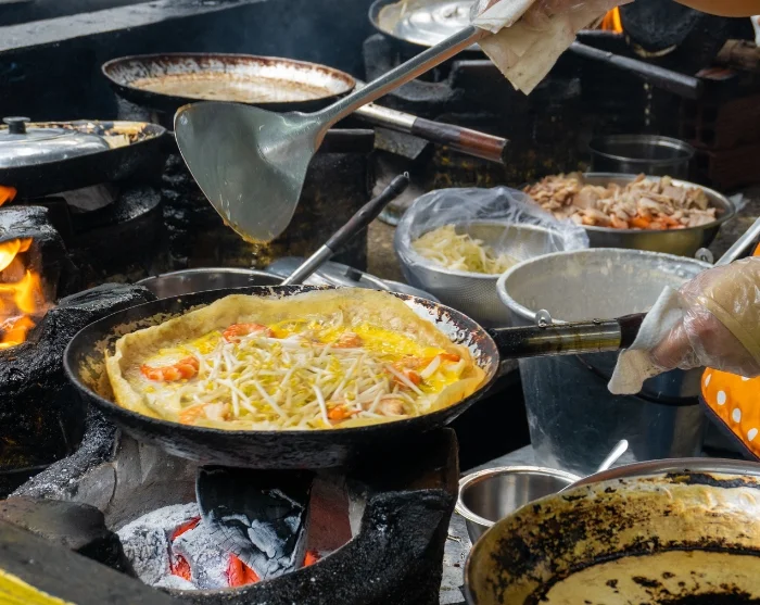 Ditt kulinariske eventyr avrundes med en skål hu tieu – en nudelrett som serveres både som suppe og i en tørr variant – samt den populære streetfood-retten bot chien. Bot chien består av små biter stekt rismel, sprø utenpå og myke inni, stekt sammen med egg og vårløk, servert med en søt-syrlig soyabasert saus og friskrevet papaya. En enkel, men utrolig smakfull rett som mange lokale unner seg som et sent kveldsmåltid.