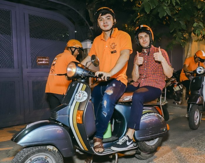 Guiden din kommer og henter deg på hotellet, og en Vespa-sjåfør står klar til å vise deg Ho Chi Minh-byen etter mørkets frembrudd. Etter å ha fått utdelt en hjelm klyver du opp bak på scooteren og suser av sted ut i det yrende folkelivet.