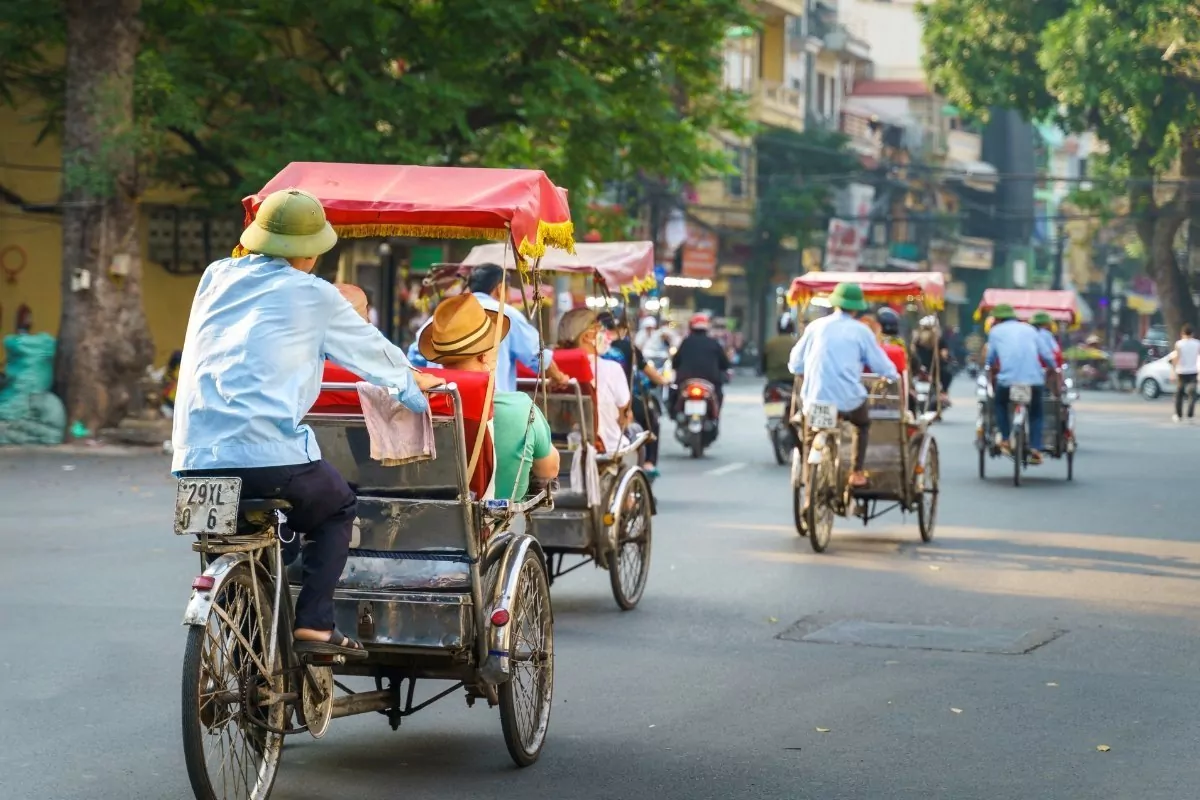 Deretter går turen til den ikoniske broen Long Bien over Den røde elv, før du legger ut på halvtimes tur med sykkeldrosje gjennom de smale kaotiske gatene og stredene i gamlebyen.